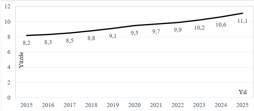 Grafik 1. Türkiye’de yaşlı erişkinlerin toplam nüfus içindeki payı (%) (2015-2025)